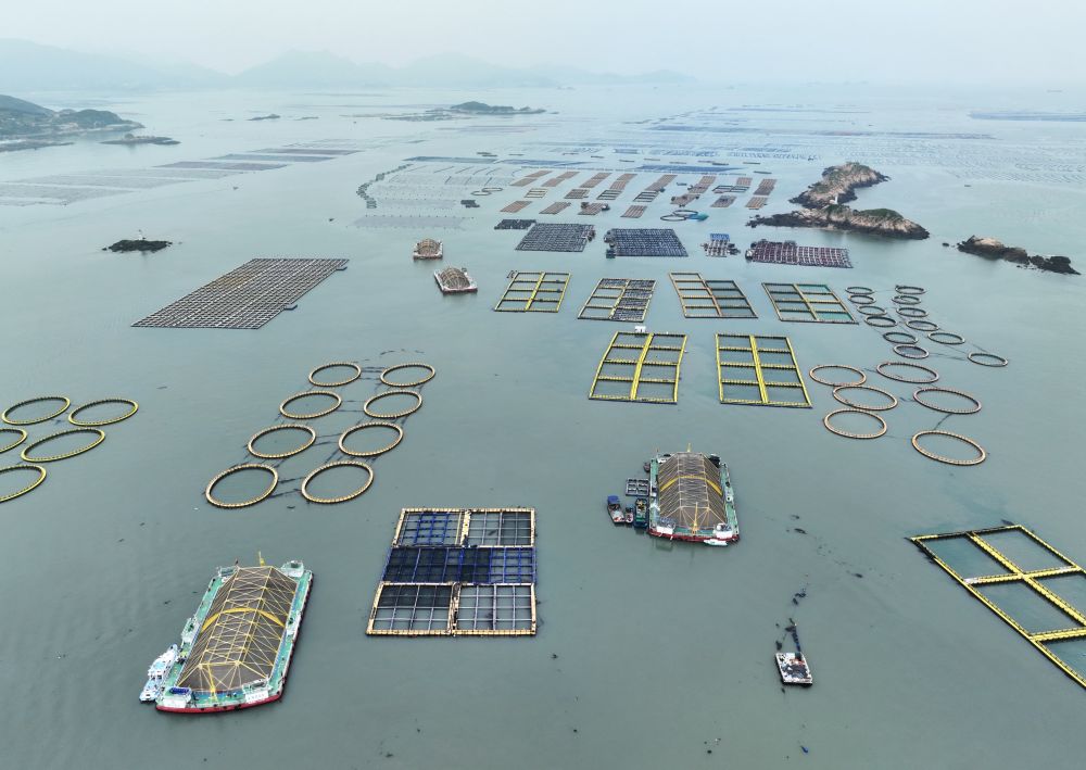 在福建連江定海灣海域,坐落著“閩投1號(hào)”“乾動(dòng)1號(hào)”“定海灣1號(hào)”等深遠(yuǎn)海養(yǎng)殖平臺(tái)。從高空俯瞰,一座座籃球場大小的鋼構(gòu)平臺(tái)臥于海上,大黃魚等養(yǎng)殖品在深海“暢游居住”。