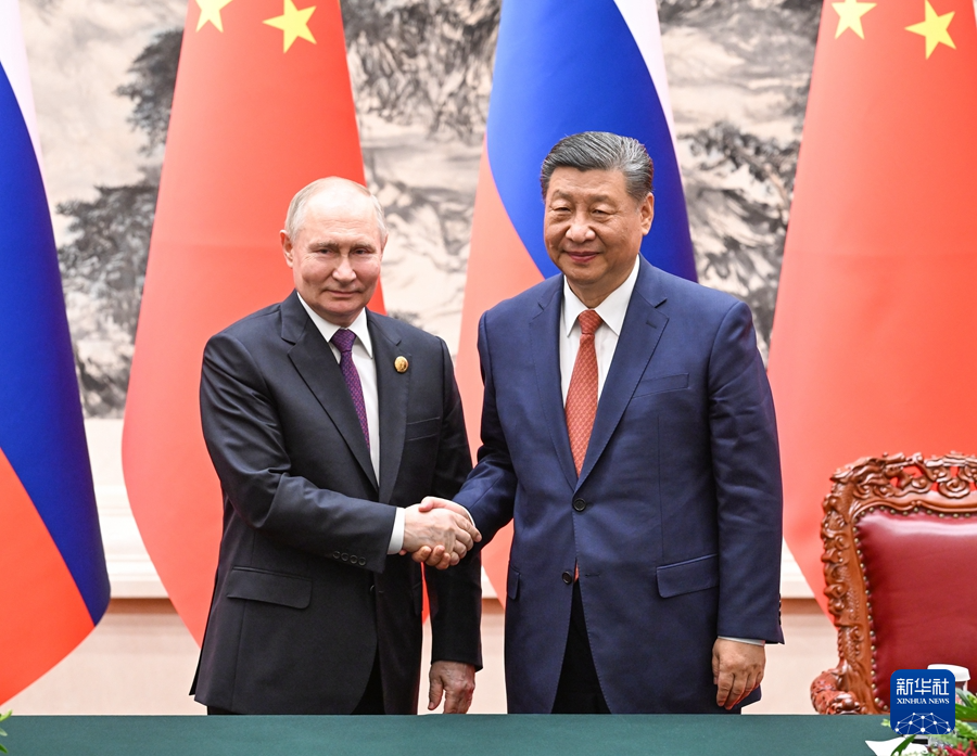 5月16日上午,國家主席習(xí)近平在北京人民大會堂同來華進(jìn)行國事訪問的俄羅斯總統(tǒng)普京舉行會談。這是會談后,兩國元首共同簽署并發(fā)表《中華人民共和國和俄羅斯聯(lián)邦在兩國建交75周年之際關(guān)于深化新時代全面戰(zhàn)略協(xié)作伙伴關(guān)系的聯(lián)合聲明》。新華社記者 饒愛民 攝