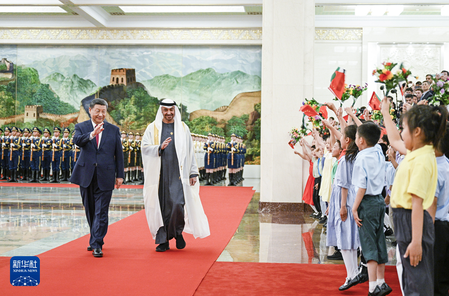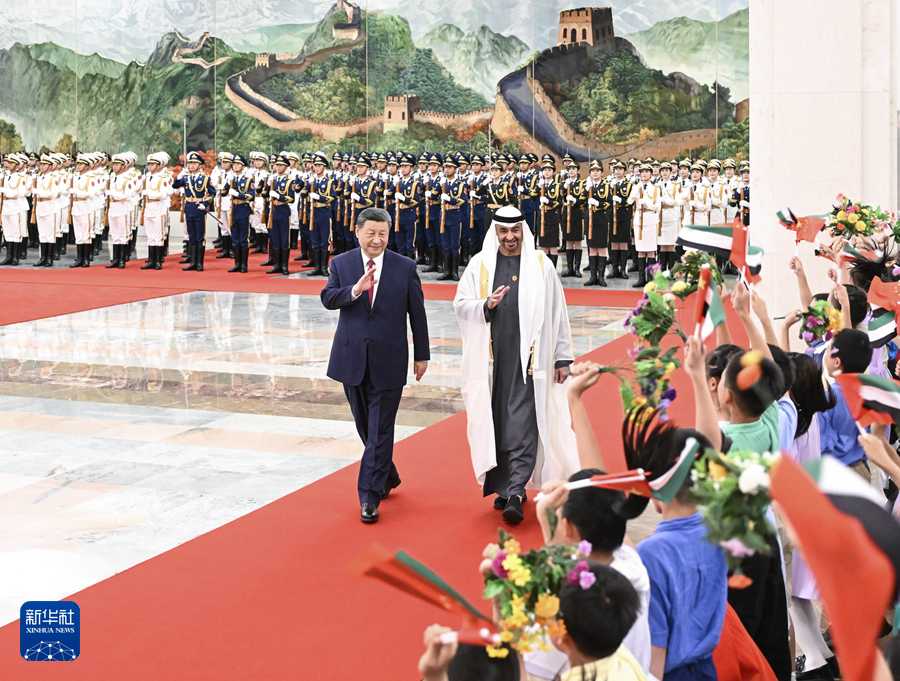 5月30日下午,國家主席習(xí)近平在北京人民大會(huì)堂同來華國事訪問并出席中國-阿拉伯國家合作論壇第十屆部長級(jí)會(huì)議開幕式的阿聯(lián)酋總統(tǒng)穆罕默德舉行會(huì)談。這是會(huì)談前,習(xí)近平在人民大會(huì)堂北大廳為穆罕默德舉行歡迎儀式。新華社記者 饒愛民 攝