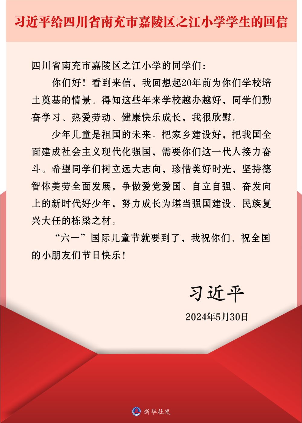 在“六一”國際兒童節(jié)即將到來之際,中共中央總書記、國家主席、中央軍委主席習(xí)近平5月30日給四川省南充市嘉陵區(qū)之江小學(xué)的學(xué)生們回信,對他們予以親切勉勵(lì),并祝他們和全國的少年兒童節(jié)日快樂。
