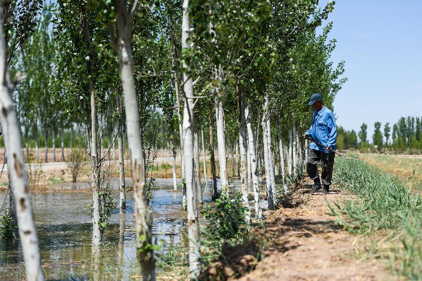 工人在內(nèi)蒙古巴彥淖爾臨河區(qū)國營新華林場管護樹木(2024年5月26日攝)。數(shù)十年來,林場結(jié)合“三北”防護林、京津風(fēng)沙源治理、低質(zhì)低效林改造等生態(tài)工程,持續(xù)提高森林覆蓋率。