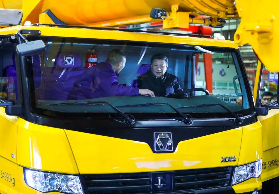 2017年12月12日,習近平總書記在江蘇徐州徐工集團坐進剛下線的XCA220型全地面起重機駕駛室,向技術人員詳細詢問起重機的性能、產(chǎn)量、價格等。