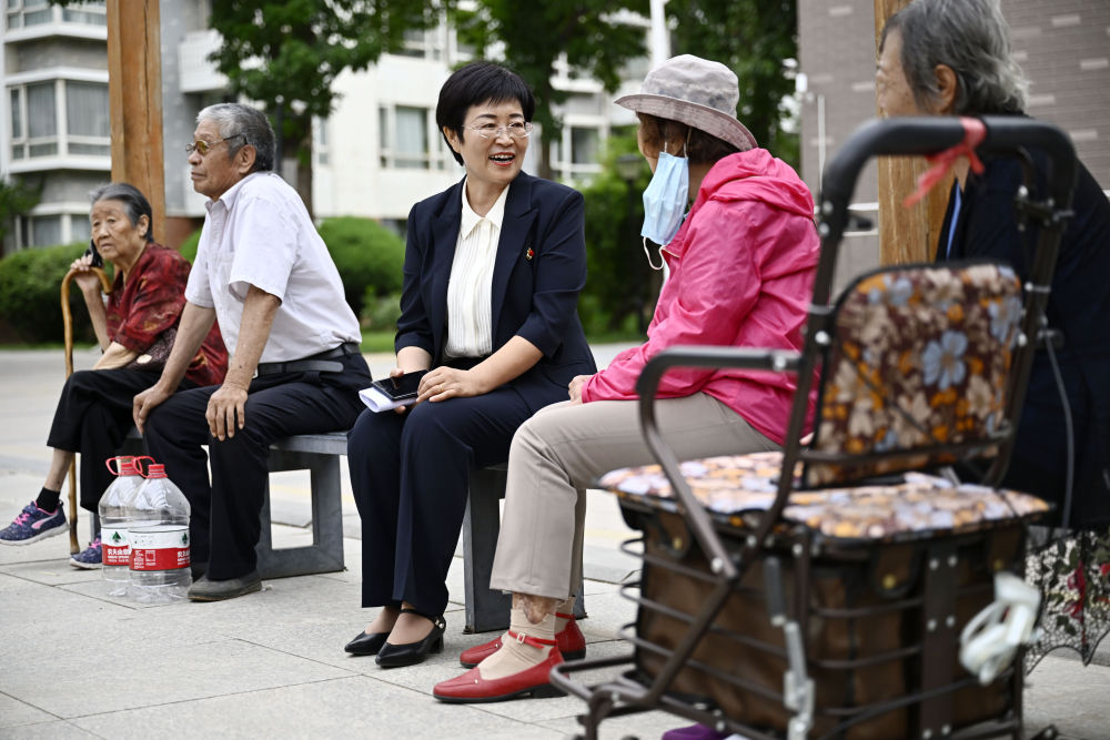 6月20日,寧夏銀川市金鳳區(qū)長(zhǎng)城花園社區(qū)黨委書(shū)記趙耐香(左三)在社區(qū)廣場(chǎng)與居民交流。