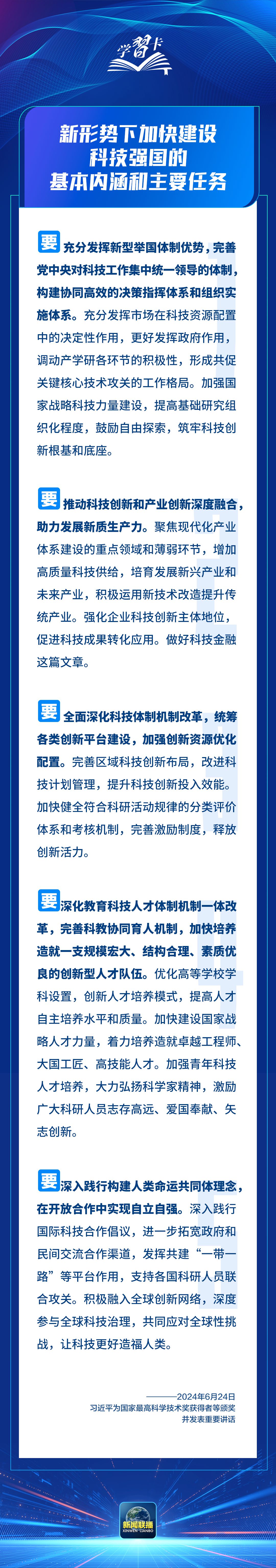 他強調(diào),科技興則民族興,科技強則國家強。中國式現(xiàn)代化要靠科技現(xiàn)代化作支撐,實現(xiàn)高質(zhì)量發(fā)展要靠科技創(chuàng)新培育新動能。必須充分認識科技的戰(zhàn)略先導地位和根本支撐作用,錨定2035年建成科技強國的戰(zhàn)略目標,加強頂層設計和統(tǒng)籌謀劃,加快實現(xiàn)高水平科技自立自強。