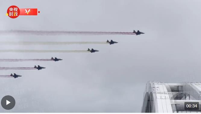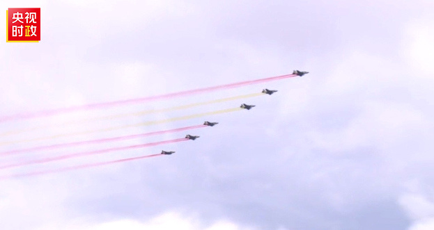 習(xí)近平主席車隊抵達(dá)哈薩克斯坦總統(tǒng)府時,六架哈薩克斯坦空軍戰(zhàn)機從總統(tǒng)府上空飛過,拉出象征中國國旗的紅黃色彩帶,以最高禮儀歡迎習(xí)近平主席。