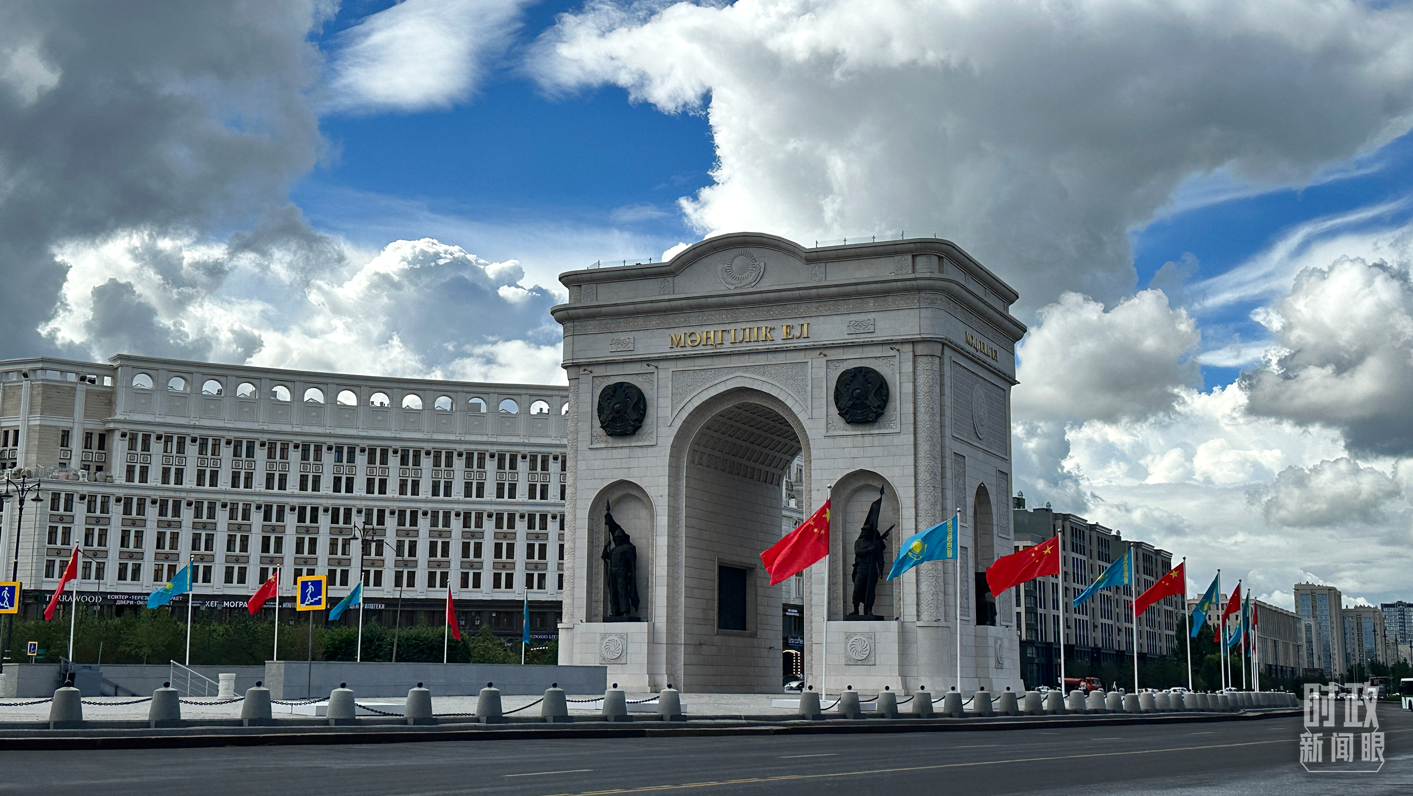 阿斯塔納地標建筑“凱旋門”兩側,中哈兩國國旗迎風招展。(總臺央視記者關舟拍攝)