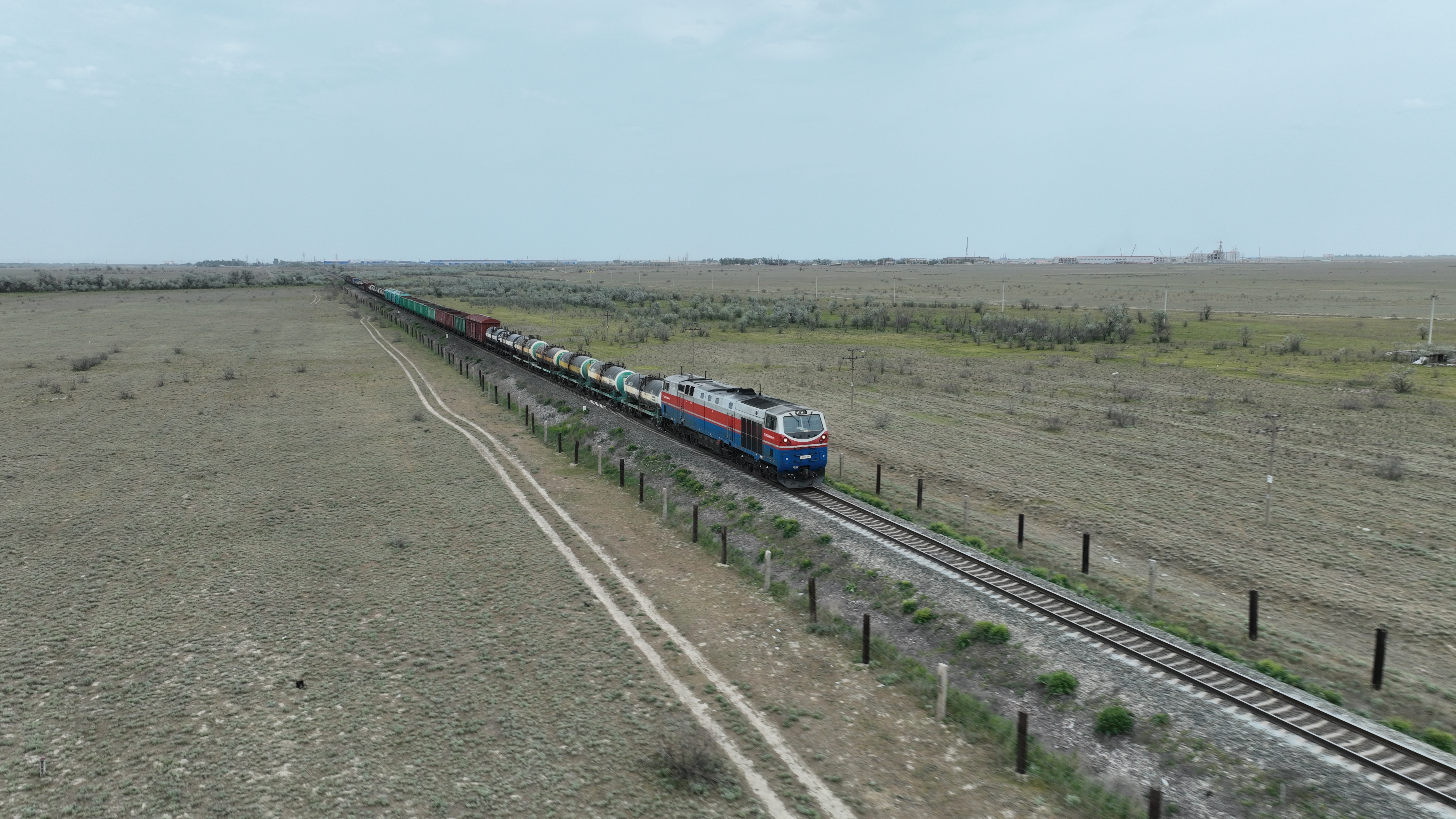 2023年5月12日,在哈薩克斯坦阿拉木圖附近,貨運(yùn)列車馳騁于阿拉木圖與中國(guó)霍爾果斯間(無人機(jī)照片)。
