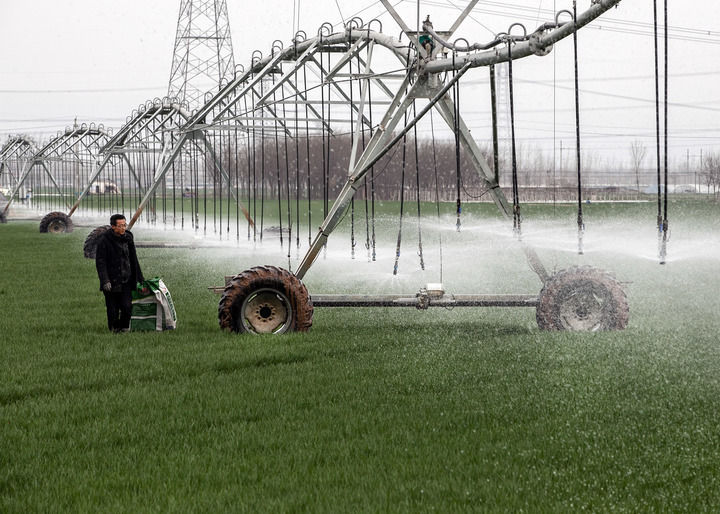 2024年3月18日,在河南省焦作市博愛縣孝敬鎮(zhèn)東原莊村瑞輝家庭農(nóng)場,村民使用全自動指針式噴灌機進行澆灌作業(yè)。