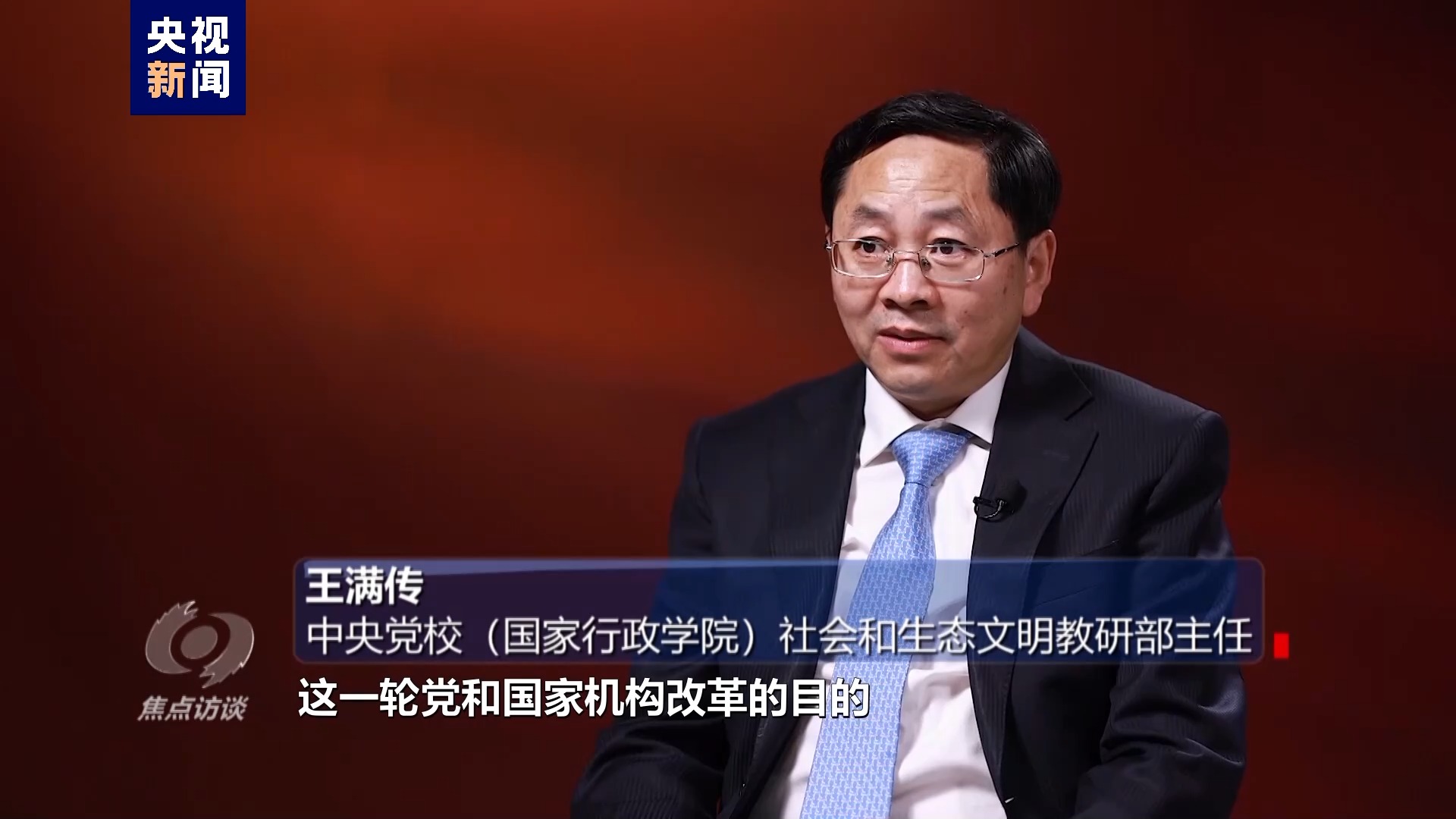 中央黨校(國家行政學(xué)院)社會和生態(tài)文明教研部主任 王滿傳:通過這一系列重要的舉措,達到了習(xí)近平總書記提出的這一輪黨和國家機構(gòu)改革的目的。就是推動黨對社會主義現(xiàn)代化建設(shè)的領(lǐng)導(dǎo),在機構(gòu)設(shè)置上更加科學(xué)、在職能配置上更加優(yōu)化、在管理運行上更加高效。
