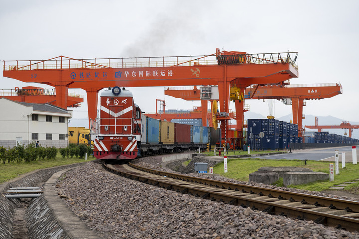 一列滿載貨物的“義新歐”中歐班列發(fā)車。拍友 胡肖飛 攝
