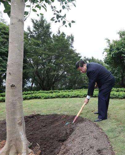 8年前種下的那棵高山榕已是亭亭如蓋、枝繁葉茂,展現(xiàn)出蓬勃的生命活力??倳涀叩綐湎?,深有感慨地說:“8年了,彈指一揮間啊。選的這個(gè)地方很好,樹冠能展開,樹長(zhǎng)得也快?!?/p>
