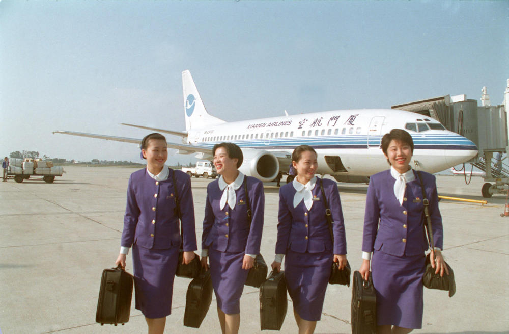 這是飛行歸來的廈航乘務(wù)員(1997年4月23日攝)。新華社記者 張國俊 攝