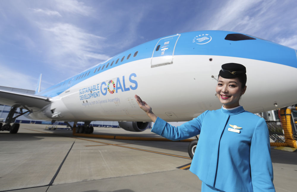 2018年1月26日,在美國查爾斯頓波音工廠,中國廈門航空公司的一名空乘人員展示廈航首架涂裝宣傳聯(lián)合國可持續(xù)發(fā)展目標的客機。新華社記者 王迎 攝
