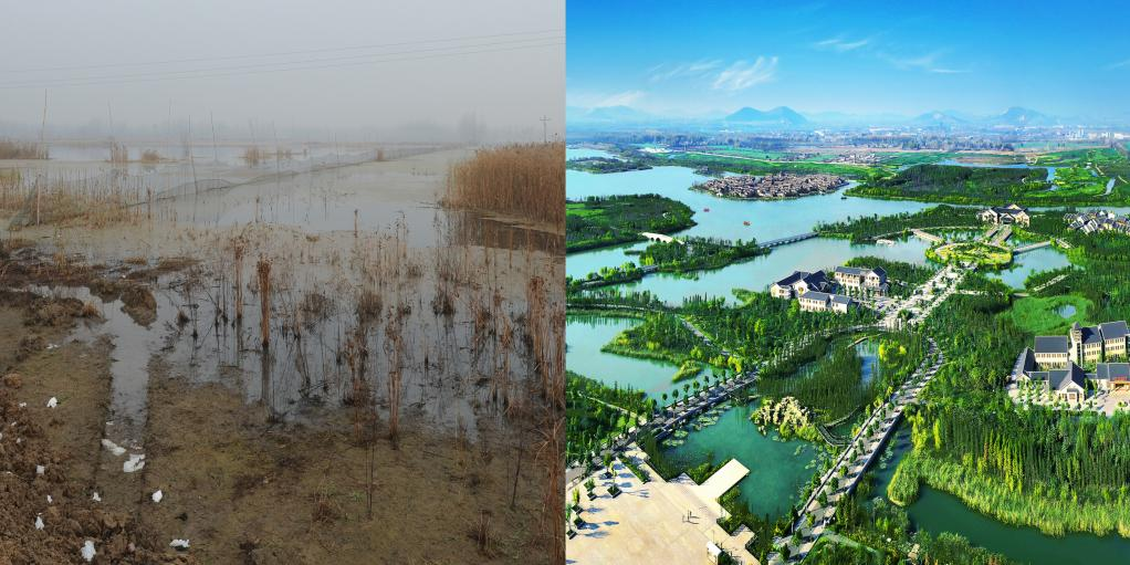 昔日的采煤塌陷區(qū)(左)被打造成濕地公園(右)(央廣網發(fā) 徐州市賈汪區(qū)攝影家協(xié)會供圖)