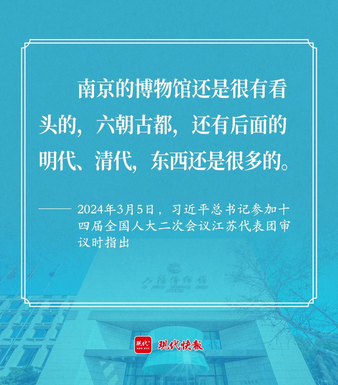 2024年3月5日,習(xí)近平總書(shū)記參加十四屆全國(guó)人大二次會(huì)議江蘇代表團(tuán)審議??倳?shū)記在聽(tīng)完南京市博物總館副館長(zhǎng)宋燕代表講述后表示,“南京的博物館還是很有看頭的,六朝古都,還有后面的明代、清代,東西還是很多的。”