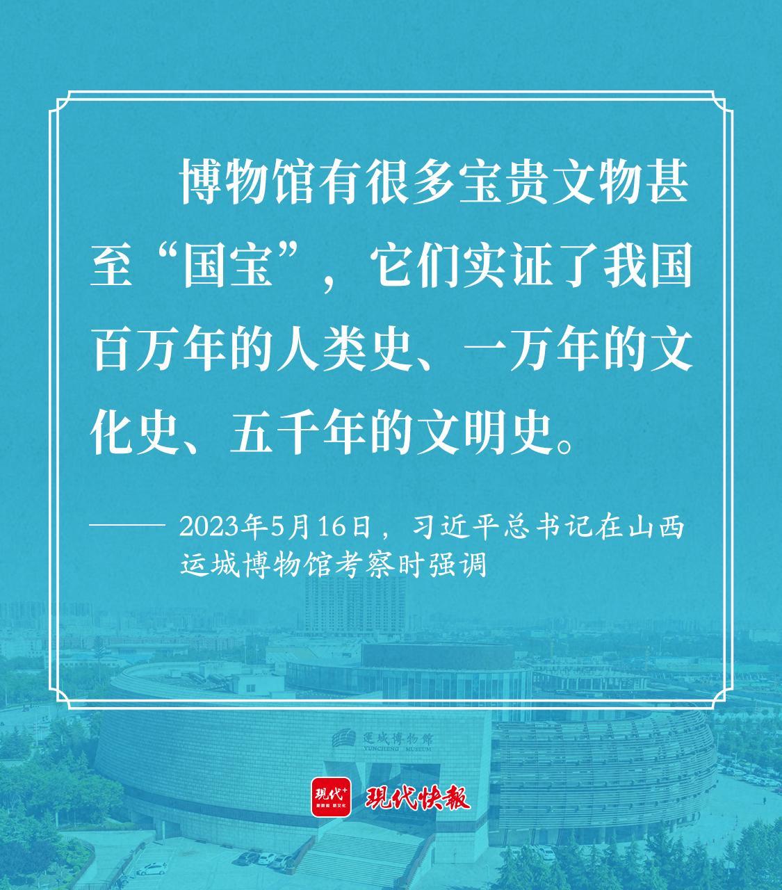 2023年5月16日,習(xí)近平總書(shū)記考察山西運(yùn)城博物館時(shí)強(qiáng)調(diào),博物館有很多寶貴文物甚至“國(guó)寶”,它們實(shí)證了我國(guó)百萬(wàn)年的人類史、一萬(wàn)年的文化史、五千年的文明史。