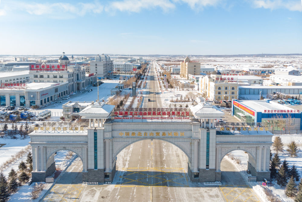 這是2024年1月31日拍攝的中國(黑龍江)自由貿易試驗區(qū)黑河片區(qū)(無人機照片)。五年來,中國(黑龍江)自由貿易試驗區(qū)將“試驗田”種成“高產田”,以全省萬分之三的面積,貢獻了全省約五分之一的實際使用外資和七分之一的外貿進出口,在對外合作、降低物流成本、培育特色產業(yè)和新業(yè)態(tài)新模式等方面深入探索,成功產出超過300項制度創(chuàng)新成果。