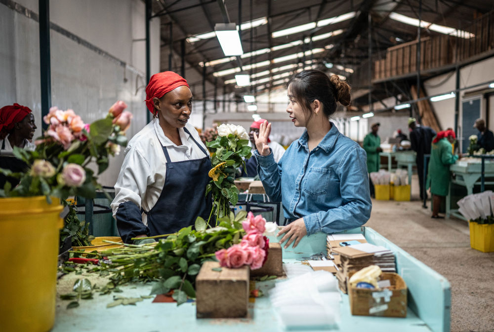 2024年5月18日,湖南璽悅國(guó)際貿(mào)易有限公司負(fù)責(zé)人黃梓楠(右)在肯尼亞納紐基的坦布濟(jì)花卉農(nóng)場(chǎng)挑選鮮花。中國(guó)政府2021年11月宣布為非洲農(nóng)產(chǎn)品輸華建立“綠色通道”,縮短檢驗(yàn)檢疫時(shí)間,擴(kuò)大關(guān)稅豁免,為肯尼亞鮮花及非洲各國(guó)的牛油果、柑橘、菠蘿等特色農(nóng)產(chǎn)品打開(kāi)了銷路。