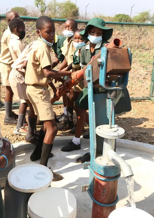 2021年11月,在津巴布韋南馬塔貝萊蘭省省會(huì)關(guān)達(dá)的塞農(nóng)多小學(xué),學(xué)生從中國援建水井里打水。