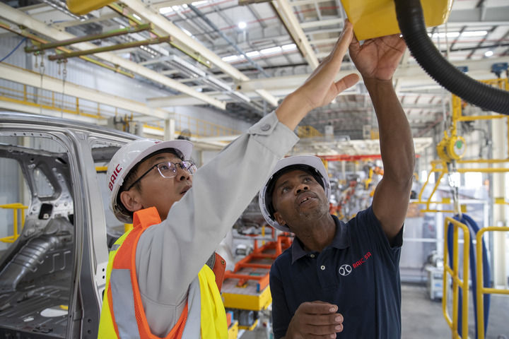 2023年5月9日,在南非東開(kāi)普省北汽南非工廠,電工邦加尼(右)與中國(guó)同事方龍?jiān)诤秆b車(chē)間內(nèi)工作。新華社記者 張譽(yù)東 攝