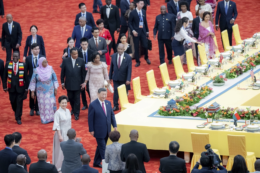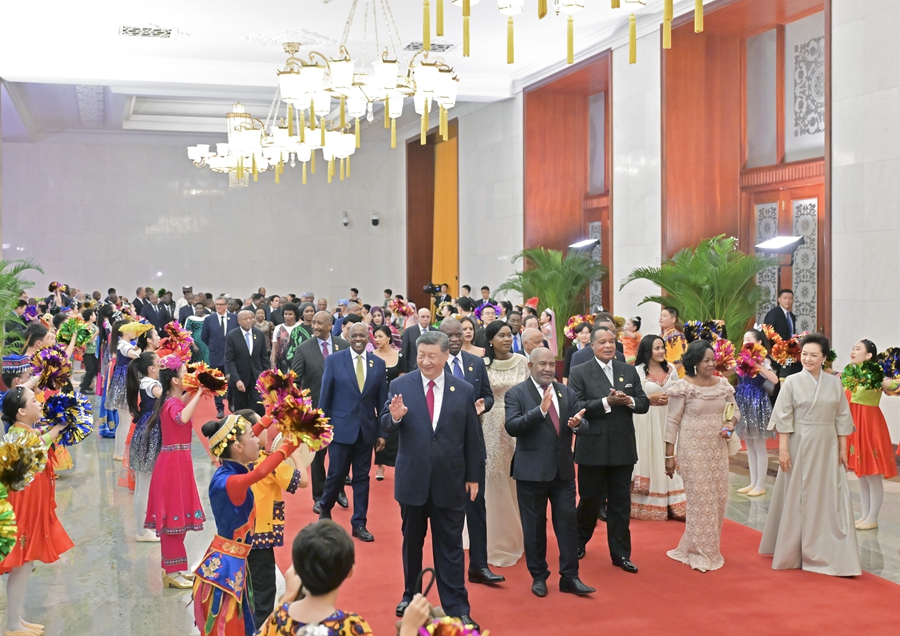 宴會(huì)后,習(xí)近平和彭麗媛同貴賓們共同觀(guān)看《攜手同行,共筑未來(lái)》文藝演出。演出展現(xiàn)了中非多彩文明美美與共、中非人民相知相親,贏得陣陣熱烈掌聲。