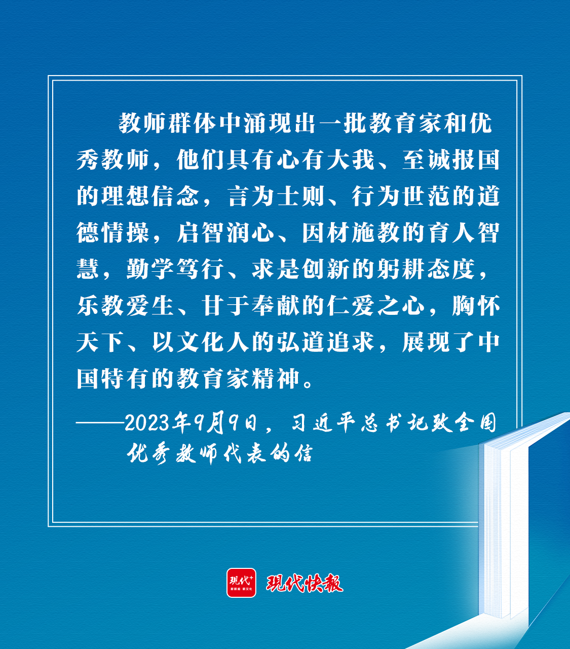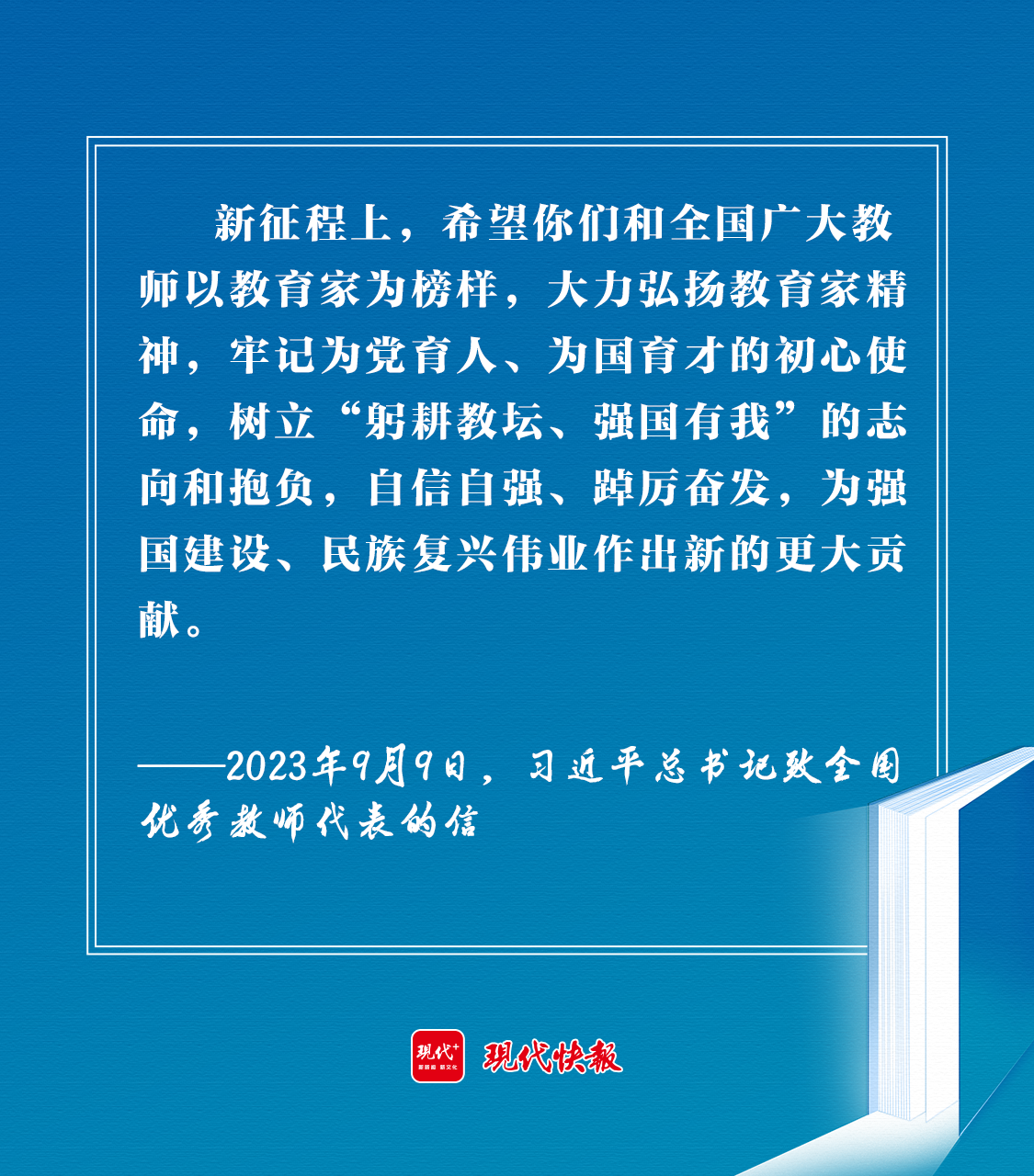 2023年9月9日,習近平總書記在致全國優(yōu)秀教師代表的信中強調:“新征程上,希望你們和全國廣大教師以教育家為榜樣,大力弘揚教育家精神,牢記為黨育人、為國育才的初心使命,樹立‘躬耕教壇、強國有我’的志向和抱負,自信自強、踔厲奮發(fā),為強國建設、民族復興偉業(yè)作出新的更大貢獻?!?/p>