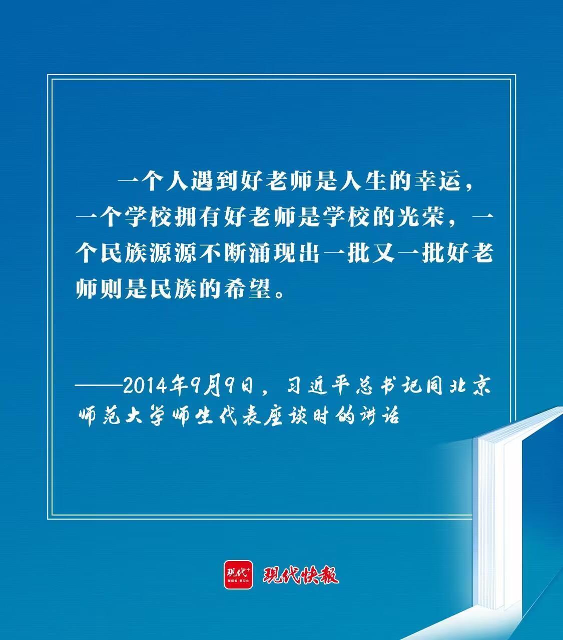 “一個人遇到好老師是人生的幸運,一個學校擁有好老師是學校的光榮,一個民族源源不斷涌現出一批又一批好老師則是民族的希望。”2014年教師節(jié)前夕,同北京師范大學師生代表座談時,習近平總書記的殷殷期盼,激勵廣大教師為民族復興拼搏奮斗。