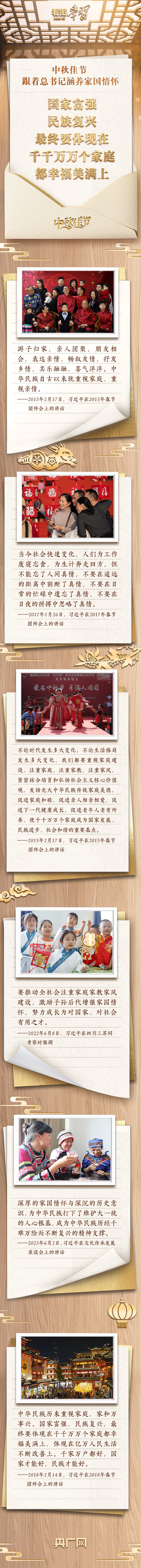 每逢佳節(jié)倍思親。中華民族自古以來便有重視家庭、家國一體的情懷。黨的十八大以來,習(xí)近平總書記提出以人民為中心的發(fā)展思想,把人民對(duì)美好生活的向往作為奮斗目標(biāo),注重加強(qiáng)家庭家教家風(fēng)建設(shè),以小家庭的和睦美滿促進(jìn)國家社會(huì)和諧穩(wěn)定。