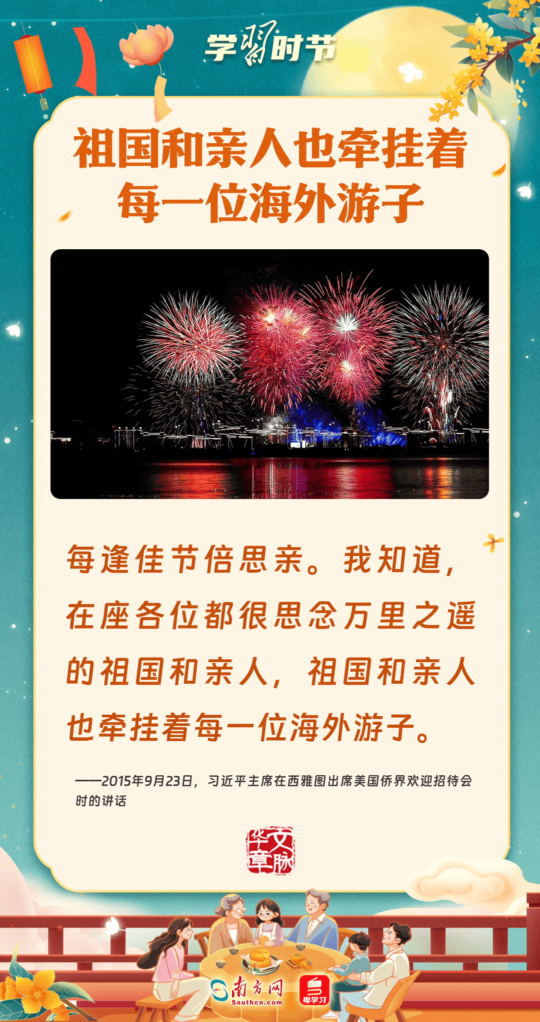 明月寄相思,家國總關(guān)情。作為中華優(yōu)秀傳統(tǒng)文化的重要載體之一,中秋節(jié)不但寄托著海內(nèi)外華人對(duì)闔家團(tuán)圓的美好期許,還承載著深厚的故鄉(xiāng)情、家國情。習(xí)近平總書記曾在多個(gè)場(chǎng)合深刻闡述個(gè)人、家庭與國家之間的關(guān)系,強(qiáng)調(diào)要厚植家國情懷,把實(shí)現(xiàn)個(gè)人夢(mèng)、家庭夢(mèng)融入國家夢(mèng)、民族夢(mèng)之中。中秋佳節(jié),讓我們一起回顧總書記那些經(jīng)典話語,共同感受他至深至厚的家國情懷。