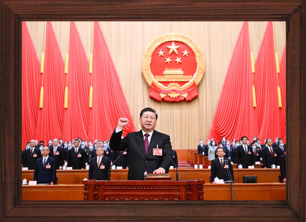 2023年3月10日,北京人民大會堂。全票當選國家主席、中央軍委主席的習近平,左手撫按《中華人民共和國憲法》,右手舉拳,面向近3000名全國人大代表,鄭重宣誓。