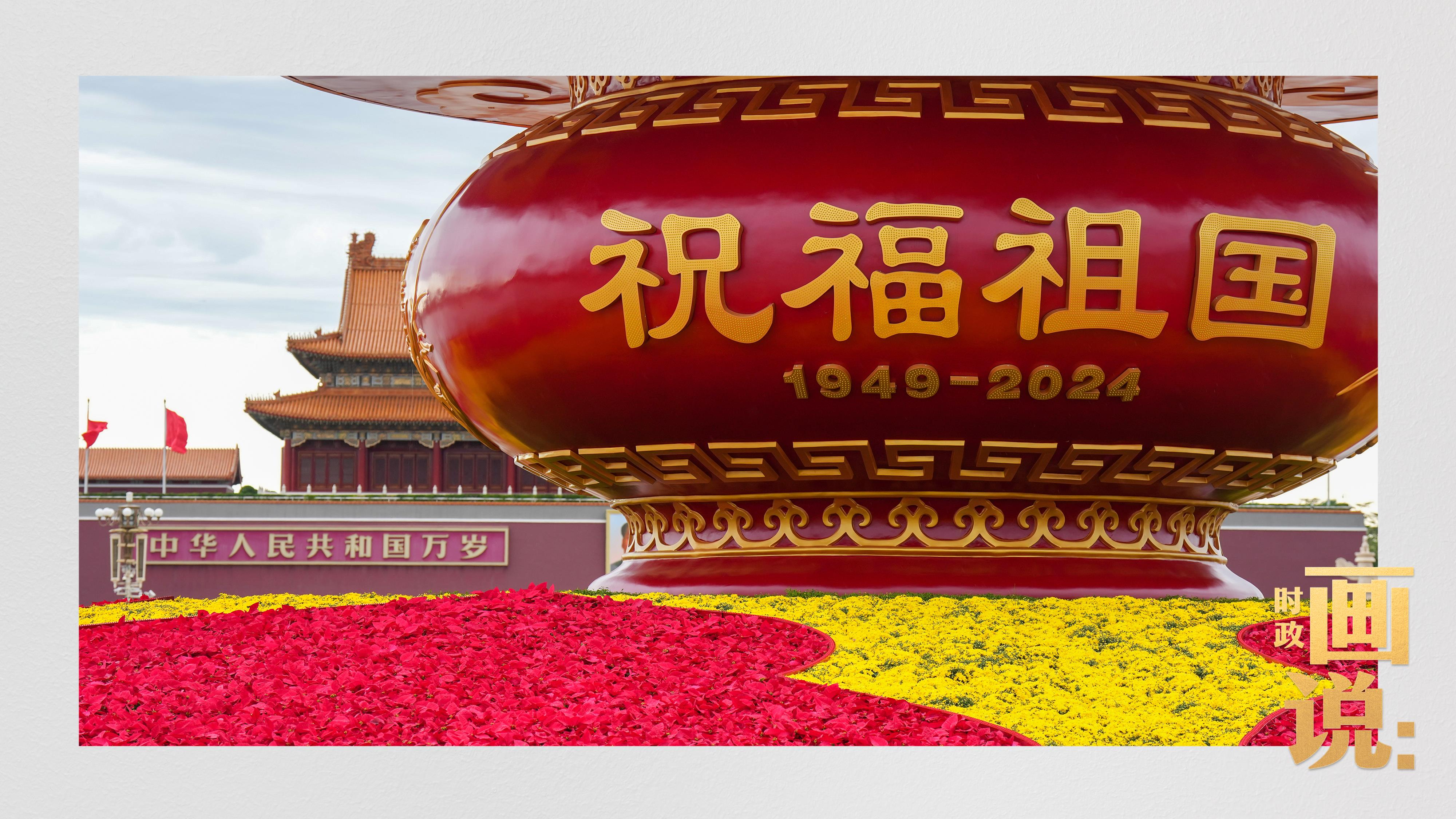 天安門(mén)廣場(chǎng)中央,“祝福祖國(guó)”巨型花籃表達(dá)著對(duì)國(guó)家繁榮富強(qiáng)的美好祝福。