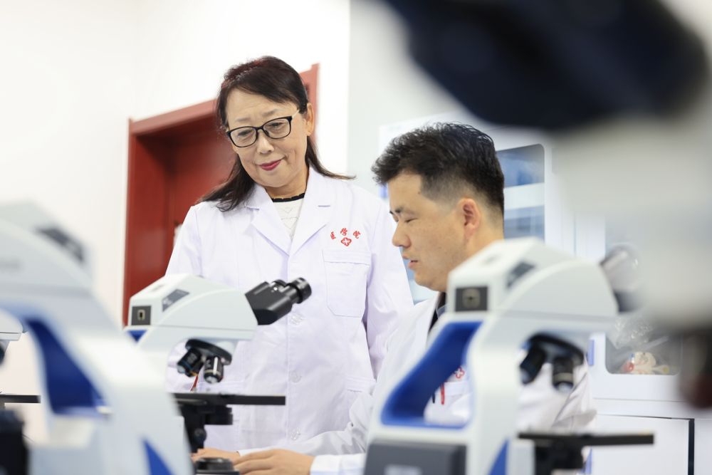 崔麗在輔導(dǎo)青年教師觀察組織切片標本。(方衛(wèi)東 攝)