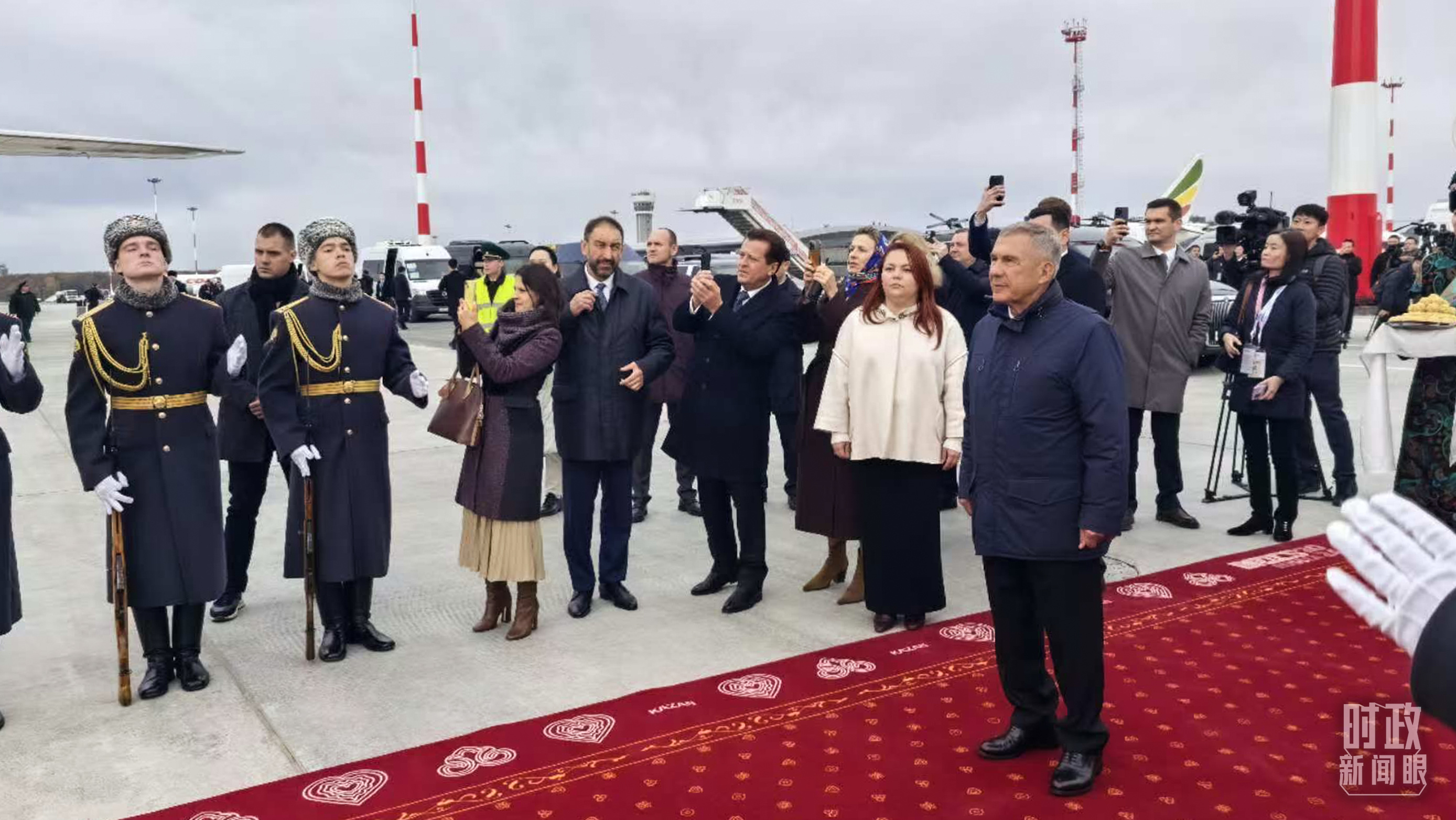 習(xí)主席專機抵達(dá)喀山國際機場時,俄羅斯聯(lián)邦韃靼斯坦共和國行政長官等在機場熱情迎接。(總臺央視記者王鵬飛拍攝)
