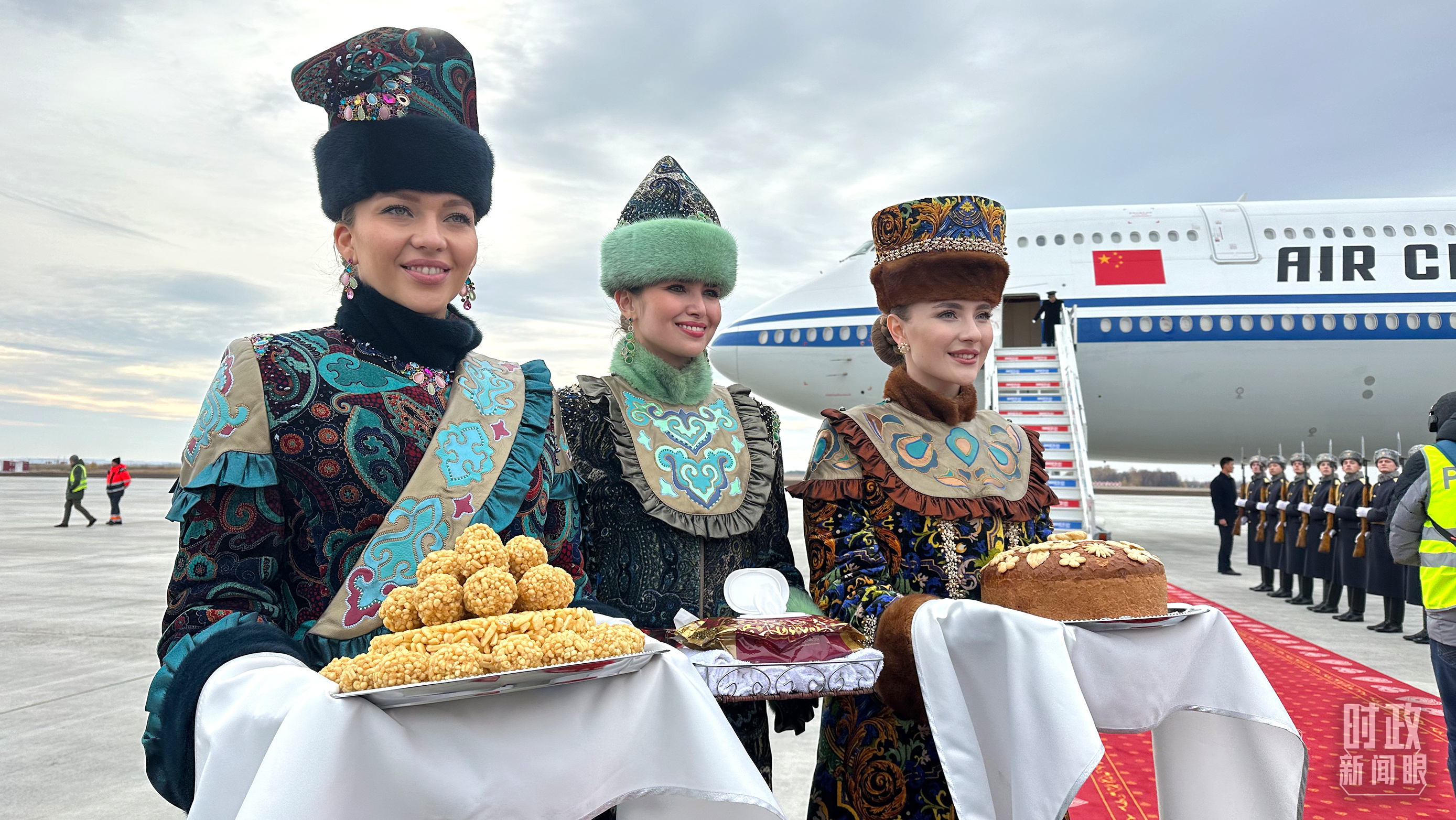 習(xí)主席專機抵達(dá)喀山國際機場時,禮兵在紅毯兩側(cè)列隊致敬,身著民族服裝的俄羅斯女青年用傳統(tǒng)禮節(jié)表示歡迎。(總臺央視記者盧心雨拍攝)