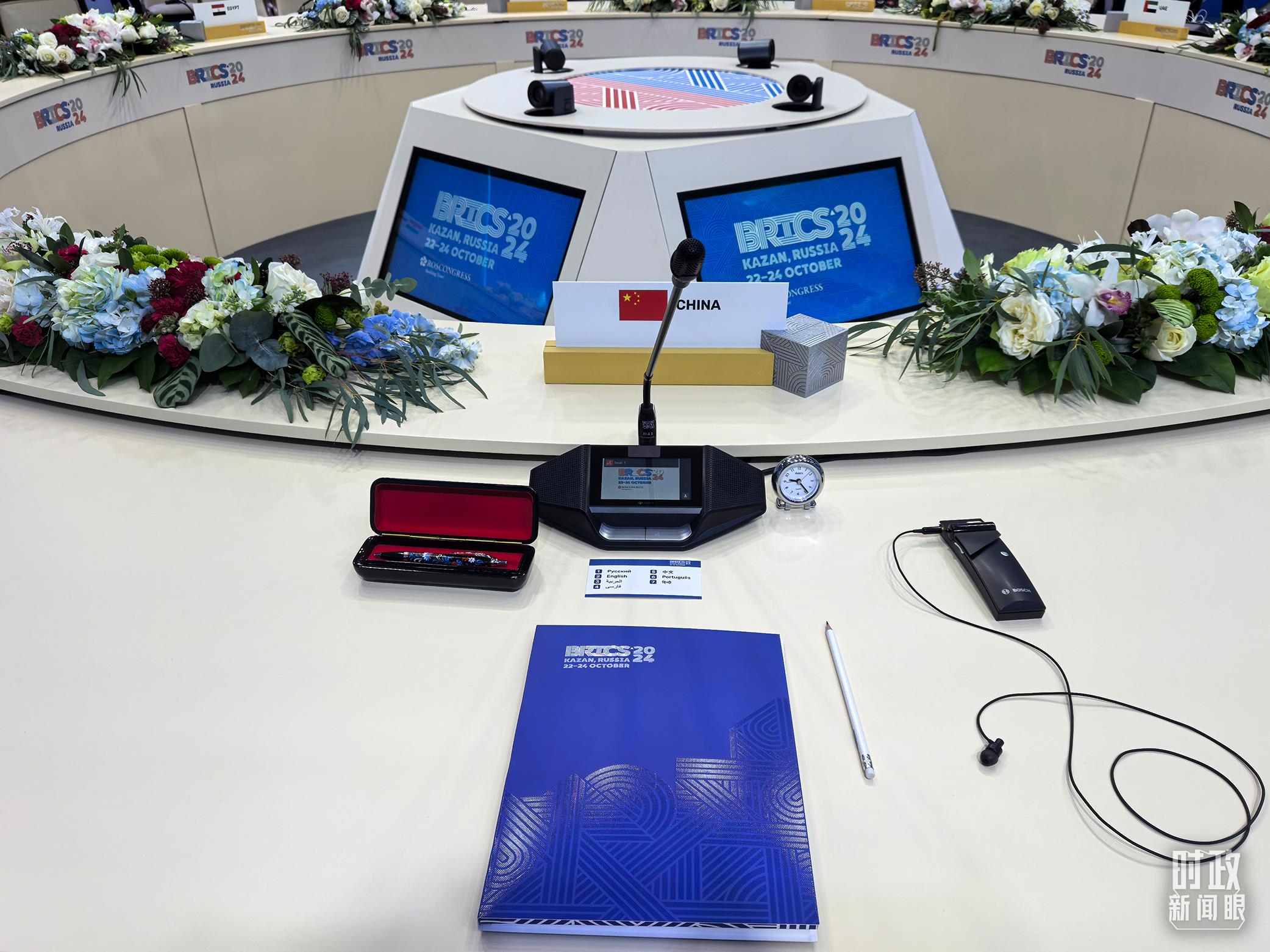 金磚國家領(lǐng)導(dǎo)人小范圍會議現(xiàn)場的會議桌。(總臺央視記者程鋮拍攝)