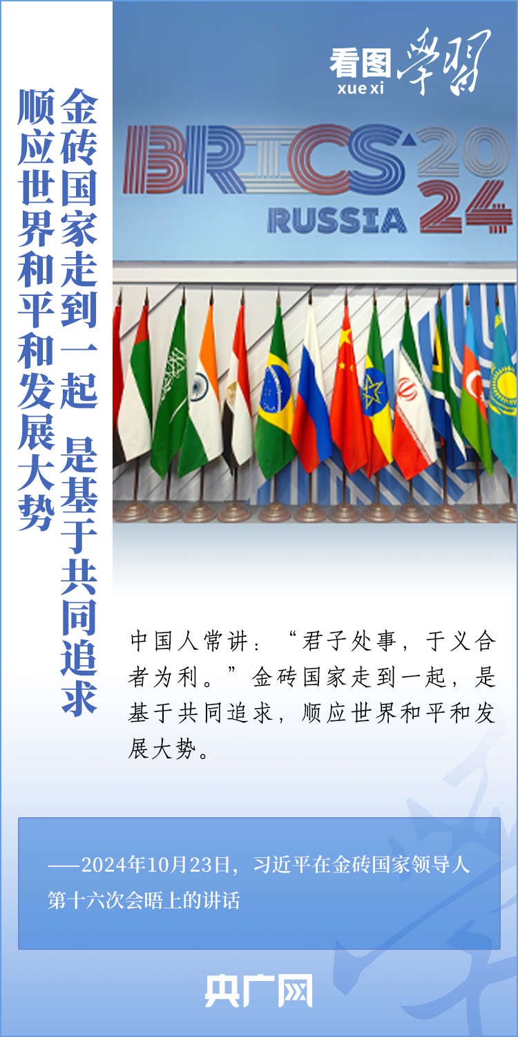 當?shù)貢r間10月23日,國家主席習近平在俄羅斯喀山出席金磚國家領導人第十六次會晤并發(fā)表重要講話。習主席深刻闡述推動“大金磚合作”高質(zhì)量發(fā)展的中國主張,就金磚大家庭發(fā)展合作提出五點務實舉措,表達了中方愿同金磚各國一道,攜手更多“全球南方”國家共同推動構(gòu)建人類命運共同體的真誠愿望。一起來學習!