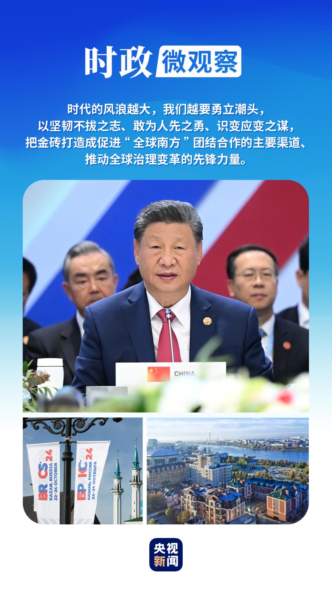 當(dāng)?shù)貢r(shí)間2024年10月23日,習(xí)近平主席出席金磚國(guó)家領(lǐng)導(dǎo)人第十六次會(huì)晤并發(fā)表重要講話。面對(duì)是任由世界動(dòng)蕩不安,還是推動(dòng)其重回和平發(fā)展正道的關(guān)鍵抉擇,習(xí)近平主席給出中國(guó)答案:“時(shí)代的風(fēng)浪越大,我們?cè)揭铝⒊鳖^,以堅(jiān)韌不拔之志、敢為人先之勇、識(shí)變應(yīng)變之謀,把金磚打造成促進(jìn)‘全球南方’團(tuán)結(jié)合作的主要渠道、推動(dòng)全球治理變革的先鋒力量?!?/p>