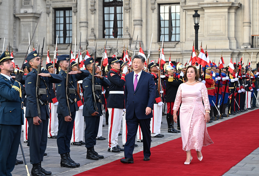 當?shù)貢r間11月14日下午,國家主席習(xí)近平在利馬總統(tǒng)府同秘魯總統(tǒng)博魯阿爾特舉行會談。博魯阿爾特在總統(tǒng)府前廣場為習(xí)近平舉行隆重盛大歡迎儀式。新華社記者 謝環(huán)馳 攝