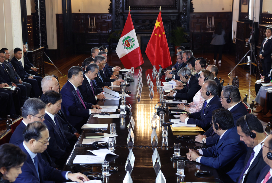 當?shù)貢r間11月14日下午,國家主席習(xí)近平在利馬總統(tǒng)府同秘魯總統(tǒng)博魯阿爾特舉行會談。新華社記者 姚大偉 攝