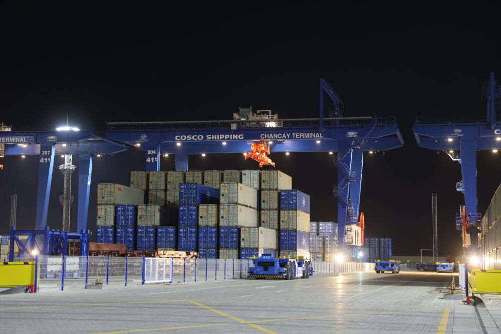 通過(guò)大屏幕連線,兩國(guó)元首共同下達(dá)開(kāi)港指令。利馬以北80公里的錢(qián)凱港,在夜幕中開(kāi)啟了港口作業(yè)。