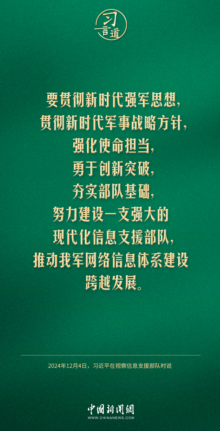 中共中央總書記、國家主席、中央軍委主席習近平4日視察信息支援部隊,代表黨中央和中央軍委,對信息支援部隊第一次黨代表大會的召開表示熱烈祝賀,向信息支援部隊全體官兵致以誠摯問候。習近平指出——