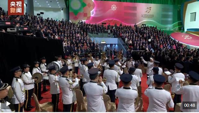 慶祝澳門回歸祖國25周年大會(huì)暨澳門特別行政區(qū)第六屆政府就職典禮20日上午在澳門東亞運(yùn)動(dòng)會(huì)體育館隆重舉行,現(xiàn)場全體起立,奏唱國歌。