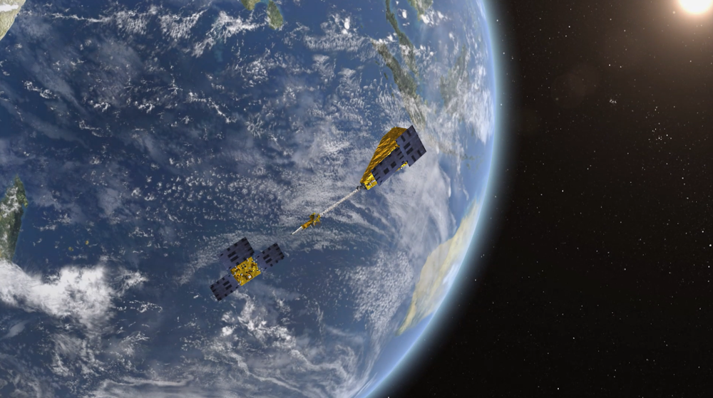“澳科一號”衛(wèi)星在軌示意圖(右為A星,左為B星)。圖片由澳門科技大學(xué)“澳科一號”團隊提供