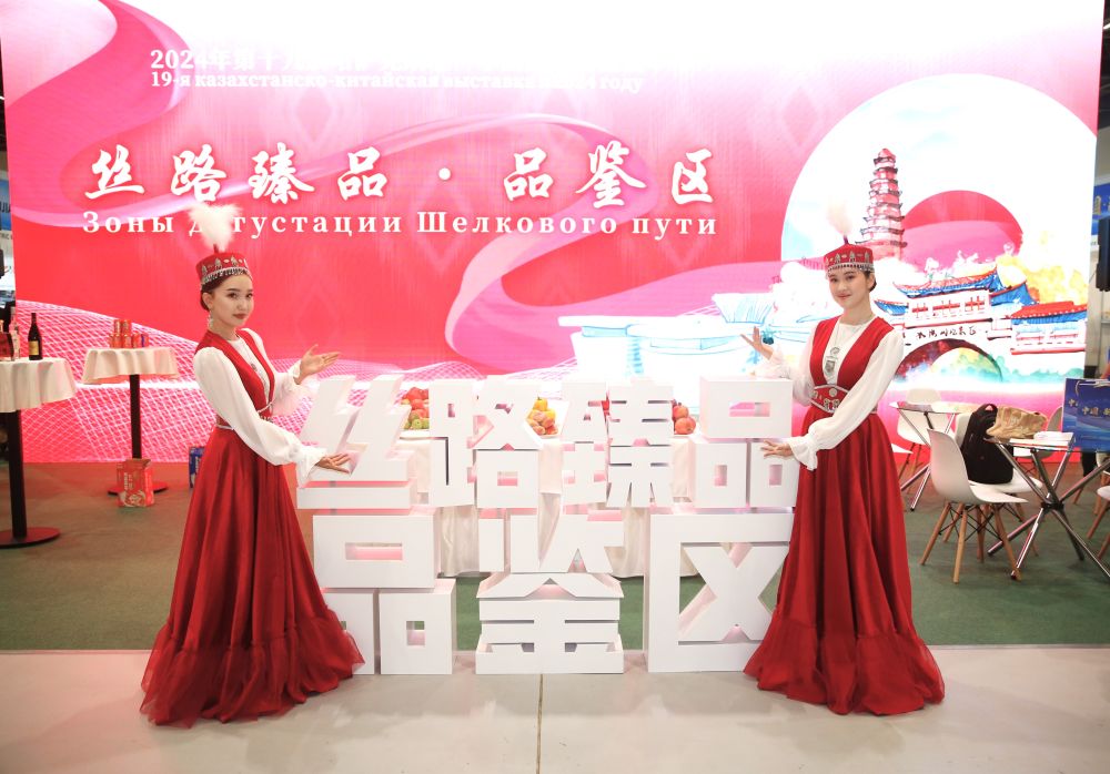 2024年8月23日,在哈薩克斯坦阿斯塔納,身著民族服飾的工作人員在第十九屆哈薩克斯坦—中國商品展覽會(huì)上歡迎觀展民眾。新華社發(fā)(奧斯帕諾夫攝)
