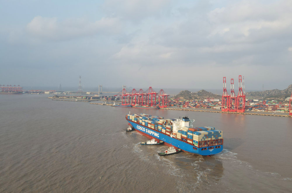 “新上?!陛喌诌_(dá)洋山港,這是自秘魯錢凱港開港后首個(gè)“錢凱—上?!闭胶酱危?024年12月18日攝,無人機(jī)照片)。新華社記者 方喆 攝
