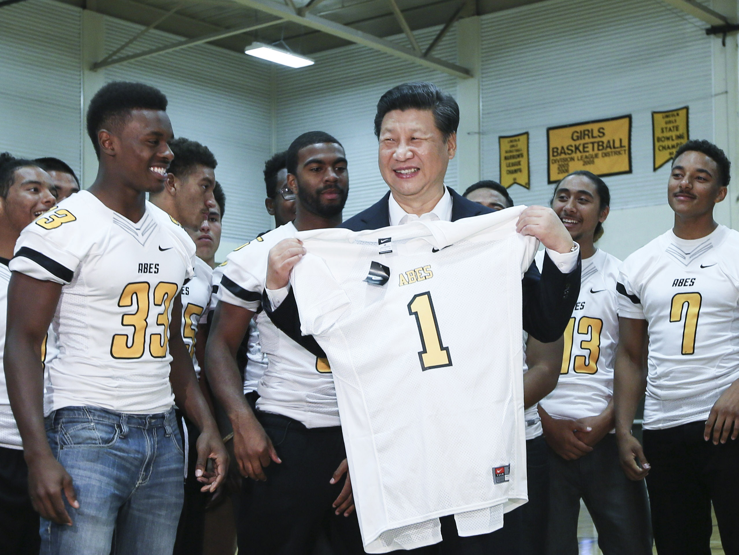 當(dāng)?shù)貢r(shí)間2015年9月23日,習(xí)近平主席參觀美國塔科馬市林肯中學(xué)。圖為習(xí)主席接受學(xué)生們贈(zèng)送橄欖球衣。