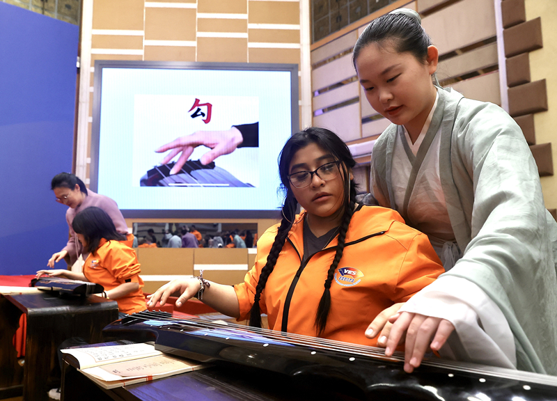 2024年3月20日,美國華盛頓州中學(xué)生代表團(tuán)北京大學(xué)交流活動(dòng)在北京大學(xué)英杰交流中心舉行。圖為來自華盛頓州的中學(xué)生體驗(yàn)古琴。