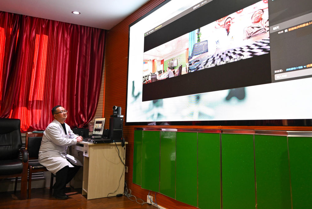 2024年12月17日,在青海省海南藏族自治州共和縣中醫(yī)院,醫(yī)生與鄉(xiāng)鎮(zhèn)衛(wèi)生院連線進(jìn)行遠(yuǎn)程會診。