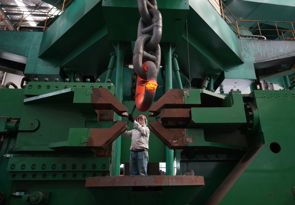 2024年6月4日,江蘇泰州靖江市江蘇亞星錨鏈股份有限公司工人在生產(chǎn)車間作業(yè)。該公司前身是40多年前創(chuàng)辦于靖江東興鎮(zhèn)的一個小廠,經(jīng)過多年發(fā)展,逐漸成長為國家級制造業(yè)單項冠軍示范企業(yè)。目前該公司船用鏈條全國市占率達70%,全球市占率超50%,業(yè)務已拓展到海洋鉆井平臺、海洋生產(chǎn)平臺、海上風電設施的系泊錨鏈等領域。