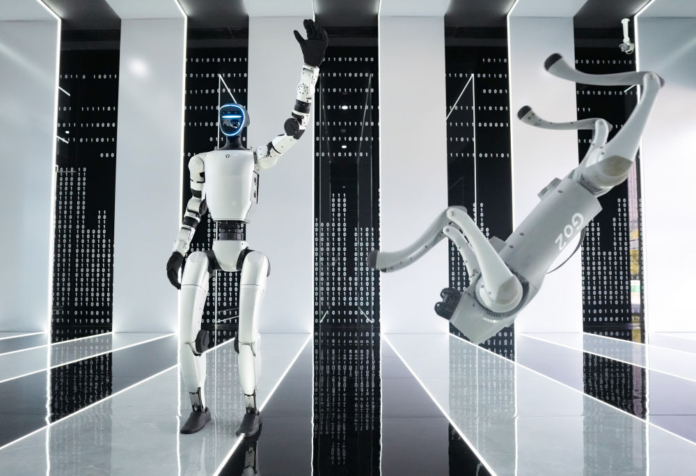 2025年3月1日,在杭州宇樹科技有限公司的產(chǎn)品展示中心,人形機器人和四足機器人在工作人員控制下做動作。人形機器人是人工智能技術的集成體現(xiàn),在這個未來產(chǎn)業(yè)的重要賽道上,一大批中國企業(yè)深耕技術、持續(xù)創(chuàng)新,國產(chǎn)機器人正在跑出“加速度”。